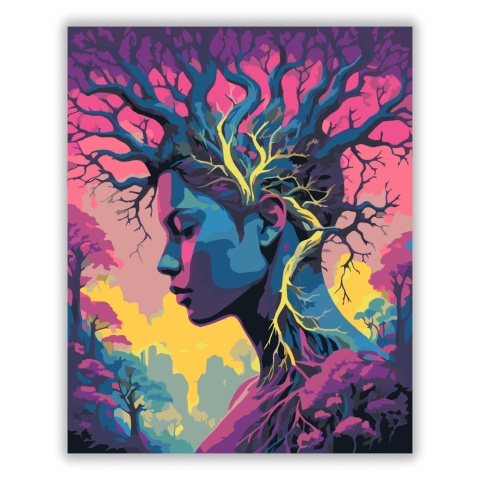 Neon Sziluett Fák és Gyökerek - számfestő készlet – 40×50 cm (Keret nélkül) A festmény egy szürreális emberi sziluettet ábrázol, amelyből neon színű fák és gyökerek nőnek ki. A kompozíció élénk rózsaszín, cián, citromsárga és lila árnyalatokban pompázik.