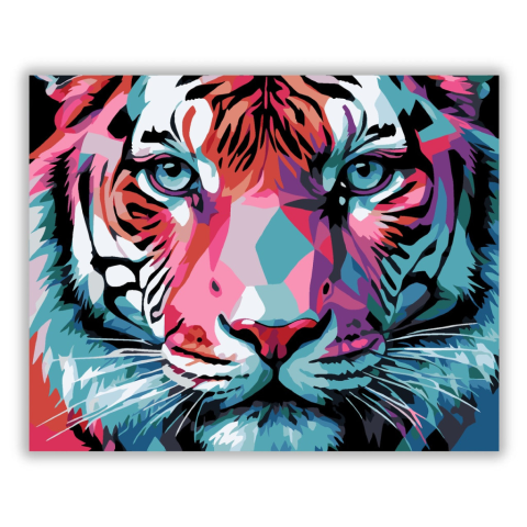 Neon Színátmenetek és Tigris Arc - számfestő készlet – 40×50 cm (Keret nélkül) A festmény egy tigris arcát ábrázolja neon narancs, türkizkék, kobaltkék és mély rózsaszín színblokkokkal. A kompozíció élénk színekkel és kontrasztos fehér kiemelésekkel ragad