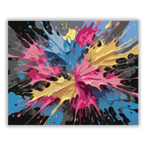 Neon Színű Impasto Káosz - számfestő készlet – 40×50 cm (Keret nélkül) A kép neon rózsaszín, citromsárga, égkék és fekete vastag festékfröccsenéseit ábrázolja, amelyek kaotikus harmóniában rendeződnek. Az élénk színek dinamikus kontrasztot alkotnak a söté