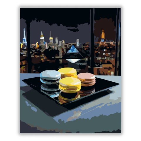 Neon Színű Macaronok Városi Háttérrel - számfestő készlet – 40×50 cm (Keret nélkül) A festmény három neon színű macaront ábrázol egy fekete tányéron, melyek egy üveg asztalon pihennek, a háttérben városi fényekkel. Az élénk sárga, kék és rózsaszín macaron