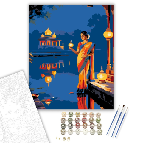 Nő Fényekkel a Tóparton - számfestő készlet – 40×50 cm (Keretre feszítve) A festmény egy nőt ábrázol száriban, amint diyákat gyújt egy tó partján alkonyatkor. A kék és arany színek harmóniája békét és nyugalmat sugároz. A jelenet a spiritualitás csendes p
