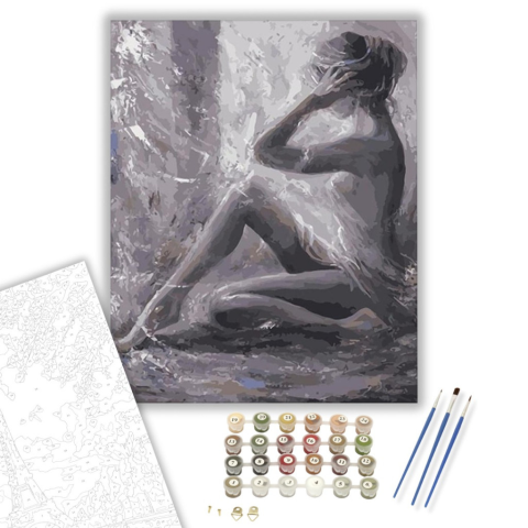 Női test - számfestő készlet – 40×50 cm (Keretre feszítve) A festmény csendes melankóliát áraszt, amely mély gondolatokba meríti a nézőt. Egy történet bontakozik ki a kép előtt, ahol a test mozdulata és helyzete érzelmeket közvetít. A monokróm színek és a