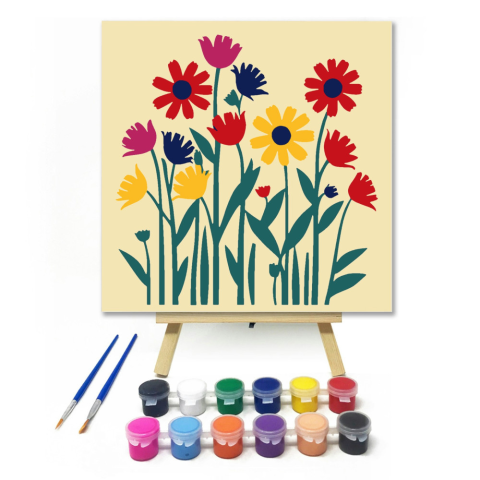 Nyári virágok tánca - gyerek számfestő készlet – 20×20 cm (Keretre feszítve) Ez a kép egy színes virágoskertet ábrázol, ahol a piros, sárga és kék virágok vidáman táncolnak a szélben. A barátságos színek és formák igazi nyári hangulatot varázsolnak a szo