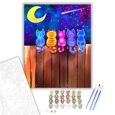 Nyávogás a Holdfényben - számfestő készlet – 40×50 cm (Keretre feszítve) Készíts gyönyörű műalkotásokat, előzetes festő tudás nélkül! Éld át az alkotás gyönyörű pillanatait és varázslatos hangulatát! Akkor is gyönyörű festményeket hozhatsz létre, ha még n