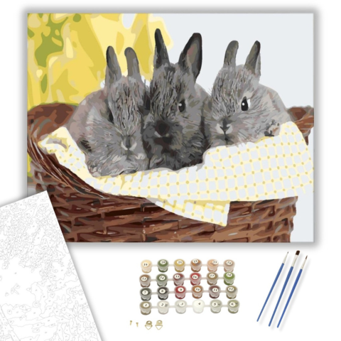 Nyuszik a kosárban - számfestő készlet – 40×50 cm (Keretre feszítve) Ez a festmény meghitt és barátságos érzéseket kelt, mintha egy csendes tavaszi reggel melegsége áradna szét a szobában. A kép mesél egy történetet három apró nyusziról, akik békésen pihe