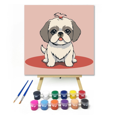 Ölelnivaló kisugárzás - gyerek számfestő készlet – 20×20 cm (Keretre feszítve) Ez a kép egy bájos, pihe-puha kutyust ábrázol, aki vidáman mosolyog a piros szőnyegen. A barátságos színek és az aranyos tekintet igazi ölelnivaló kisugárzást kölcsönöznek neki