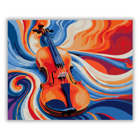 Olvadó Hegedű Hullámok - számfestő készlet – 40×50 cm (Keret nélkül) A festmény egy hegedű absztrakt ábrázolását mutatja, amely hanghullámokba olvad. A színek tüzes narancsok, mély kékek és málna vörösek, amelyek mozgást és dallamot idéznek elő. A kép a z