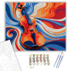 Olvadó Hegedű Hullámok - számfestő készlet – 40×50 cm (Keretre feszítve) A festmény egy hegedű absztrakt ábrázolását mutatja, amely hanghullámokba olvad. A színek tüzes narancsok, mély kékek és málna vörösek, amelyek mozgást és dallamot idéznek elő. A kép
