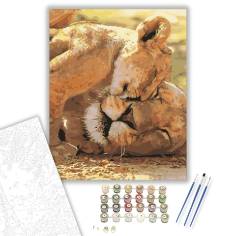 Oroszlán szeretet - számfestő készlet – 40×50 cm (Keretre feszítve) Ez a festmény békés és meghitt pillanatot ábrázol, amely a nézőt nyugalommal tölti el. Két oroszlán bensőséges kapcsolata elevenedik meg előttünk, mintha egy titkos történet részesei lenn
