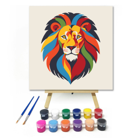 Oroszlánfej - gyerek számfestő készlet – 20×20 cm (Keretre feszítve) Ez a kép egy színes oroszlánfejet ábrázol, ahol a sörény minden szivárványszínben pompázik. A barátságos oroszlán csak arra vár, hogy a gyerekek életre keltsék őt a festékek segítségével