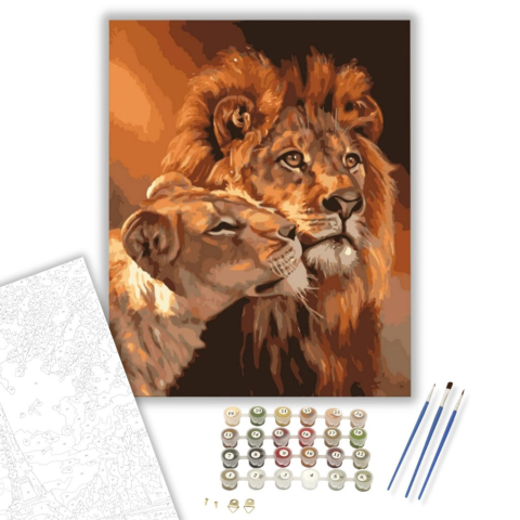 Oroszlánok - számfestő készlet – 40×50 cm (Keretre feszítve) Ez a festmény mélységes nyugalmat és erőt áraszt, ahogy az oroszlánok tekintete találkozik. A kép egy történetet mesél el a természet szépségéről és az állatok közötti különleges kapcsolatról. A