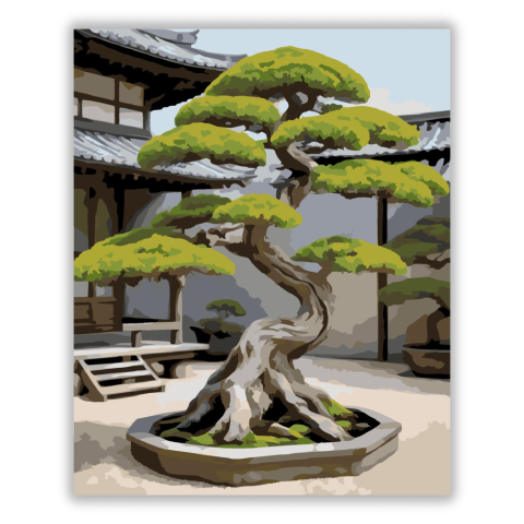 Ősi Bonsai és Kő Lámpás - számfestő készlet – 40×50 cm (Keret nélkül) A festmény egy évszázados bonsai fát ábrázol, amely egy kanyargós, időjárás által formált törzzsel áll egy csendes japánkertben. A finom zöld árnyalatok és a gondosan gereblyézett kavic