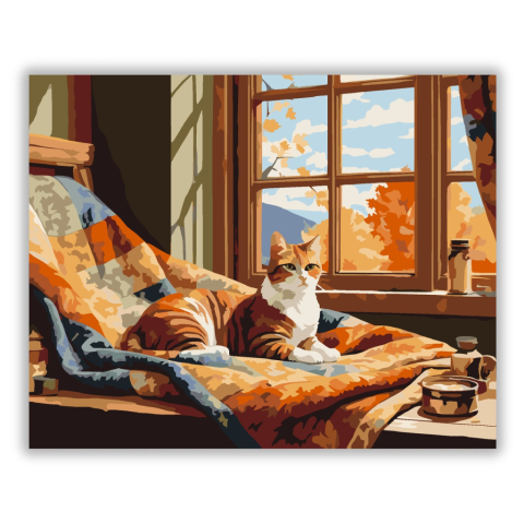 Őszi Ablak Macskával - számfestő készlet – 40×50 cm (Keret nélkül) A festmény egy otthonos padlásszobát ábrázol, ahol egy macska szundikál egy gyapjútakarón az ablak előtt. Az ablakon keresztül aranyló falevelek láthatók, amelyek az őszi táj meleg színeit