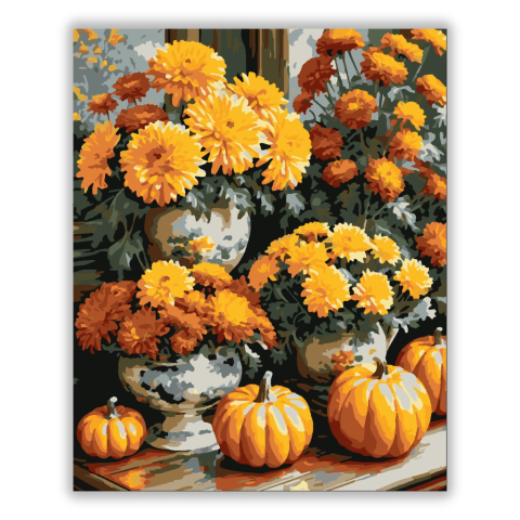 Őszi aranyló virágeső - számfestő készlet – 40×50 cm (Keret nélkül) Ez a festmény egy varázslatos őszi csendéletet ábrázol, ahol ragyogó sárga és narancssárga krizantémok hullanak le, körülvéve fényesen csillogó tököket. A virágok és tökök meleg színei tö