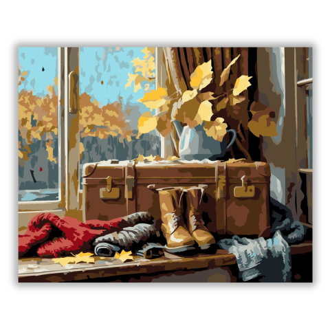 Őszi Csendélet Bőrönddel - számfestő készlet – 40×50 cm (Keret nélkül) A festmény egy vintage bőröndöt ábrázol, kötött ruhákkal és csizmákkal egy esős ablakpárkányon. Az ablakon kívül aranysárga levelek kapaszkodnak, míg a háttérben halk esőcseppek hullan