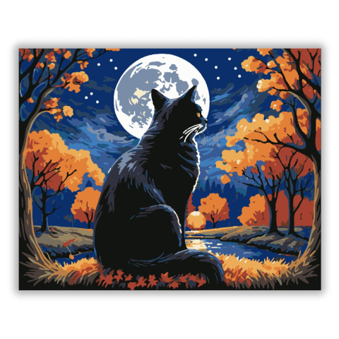 Őszi Éjszakák Mágus Macskája - számfestő készlet – 40×50 cm (Keret nélkül) Ez a festmény egy elegáns fekete macskát ábrázol, amint egy őszi erdőben ülve bámul a teliholdra. Az aranyló falevelek és a csillagos ég mellett a festmény mélykék árnyalatai varáz