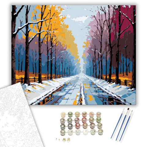 Őszi Elmúlás - számfestő készlet – 40×50 cm (Keretre feszítve) Egy hosszú, egyenes út szeli át a hóval borított tájat, ahol az erdő fái sárga és vörös levelekkel bólintanak a tél közeledtére. A jéghideg égbolt és a havas mezők kontrasztja egy varázslatos,