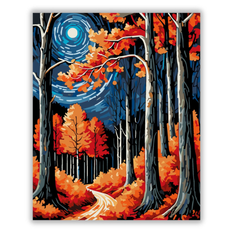 Őszi Erdő Fényei - számfestő készlet – 40×50 cm (Keret nélkül) A festmény egy őszi erdőt ábrázol, ahol a holdfény megvilágítja a narancs és vörös lombokat. Az élénk kontrasztok és a lendületes ecsetvonások kiemelik a természet dinamikáját. A kompozíció el