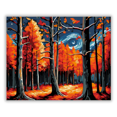 Őszi Erdő Ragyogása - számfestő készlet – 40×50 cm (Keret nélkül) A festmény az őszi erdő varázsát örökíti meg, lendületes ecsetvonásokkal és élénk, meleg színekkel. Az aranyló és narancssárga árnyalatok kontrasztban állnak a mélykék égbolttal, visszaadva