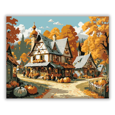 Őszi falusi idill - számfestő készlet – 40×50 cm (Keret nélkül) Ez a festmény egy gyönyörű őszi falusi tájat ábrázol, bájos házakkal, sárguló fákkal és dísztökökkel. A meleg őszi színek és a bájos részletek tökéletesen megteremtik a vidéki idill hangulatá