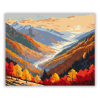 Őszi Hegyi Völgy - számfestő készlet – 40×50 cm (Keret nélkül) A festmény egy ködös hegyi völgyet mutat be hajnalban, ahol narancssárga, vörös és sárga fák borítják a lejtőket, miközben a nap aranysugarai áttörik a párát. Az élénk őszi színek és a lágy fé