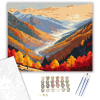 Őszi Hegyi Völgy - számfestő készlet – 40×50 cm (Keretre feszítve) A festmény egy ködös hegyi völgyet mutat be hajnalban, ahol narancssárga, vörös és sárga fák borítják a lejtőket, miközben a nap aranysugarai áttörik a párát. Az élénk őszi színek és a lág