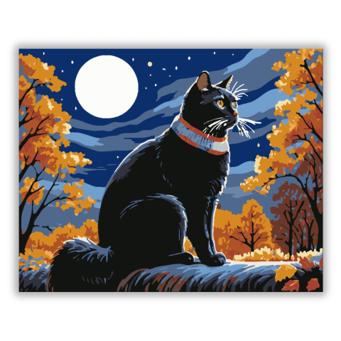 Őszi Holdfény Macskaszemmel - számfestő készlet – 40×50 cm (Keret nélkül) Fedezd fel a káprázatos őszi tájat ezen a festményen, ahol egy elegáns fekete macska ül a kőn, szemlélődve a holdfényes éjszakát. A ragyogó narancs és arany levelek élénk kontraszto