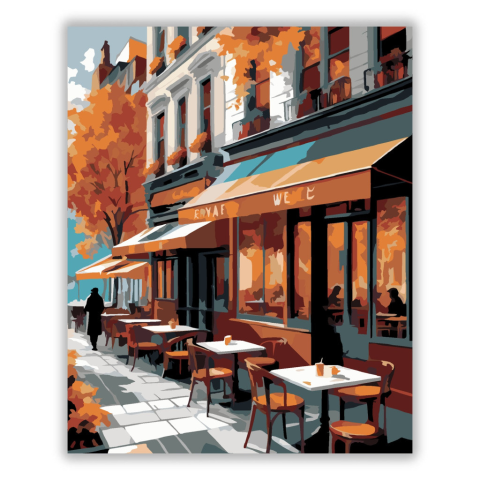 Őszi Kávézó Terasz - számfestő készlet – 40×50 cm (Keret nélkül) A festmény egy városi kávézó teraszát ábrázolja, ahol narancs és bordó levelű fák borítják az utcát. A meleg őszi árnyalatok és a járókelők barátságos, meghitt hangulatot keltenek. A kép az