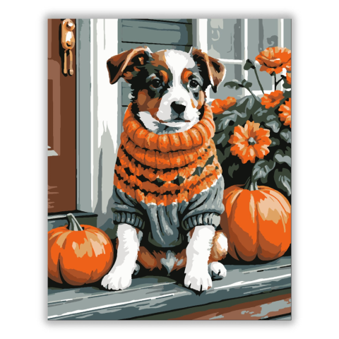 Őszi kiskutya pulóverben - számfestő készlet – 40×50 cm (Keret nélkül) Ez a festmény egy bájos kiskutyát ábrázol, aki egy őszi mintás pulóverben ücsörög tökök között. A háttérben virágok és őszi dekorációk találhatók, ami a képet még hangulatosabbá teszi.