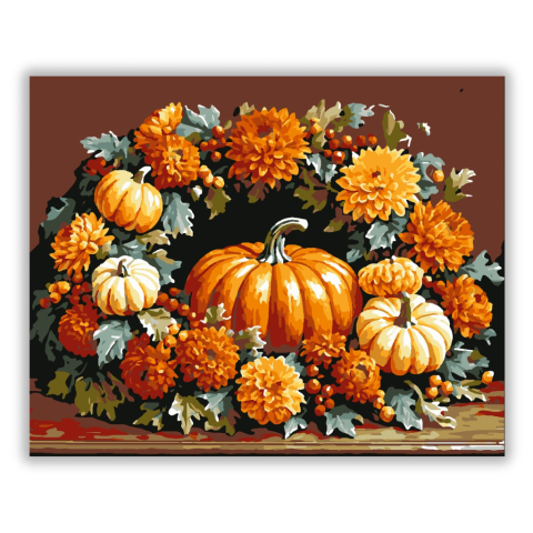 Őszi koszorú tökökkel - számfestő készlet – 40×50 cm (Keret nélkül) Ez a festmény egy gyönyörű őszi koszorút ábrázol, amelyet különböző méretű tökök és színes krizantémok díszítenek. Az élénk narancs, sárga és zöld levelek tökéletesen megidézik az őszi ha