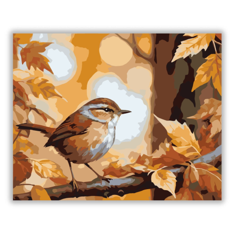 Őszi Ökörszem - számfestő készlet – 40×50 cm (Keret nélkül) A festmény egy ökörszemet ábrázol, amint őszi levelek között pihen egy ágon. A barna és arany tollazat tökéletes harmóniában van a meleg, szezonális színekkel. A kép a nyugalmat és az ősz varázsá
