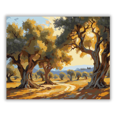 Őszi Olajfa Liget - számfestő készlet – 40×50 cm (Keret nélkül) A festmény egy békés olajfa ligetet ábrázol, ahol az ősi fák csavarodott törzseit arany napfény világítja meg. A képen a meleg arany és ezüstös színek dominálnak, nyugodt és időtlen hangulato