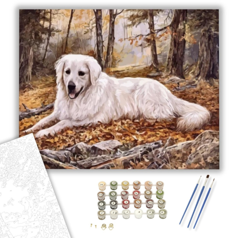 Őszi pihenő - számfestő készlet – 40×50 cm (Keretre feszítve) Ez a festmény békés őszi hangulatot áraszt, amely a nyugalom és a természet közelségének érzését kelti. Egy elragadó jelenet bontakozik ki, ahol az idő megáll, és csak a pillanat szépsége létez