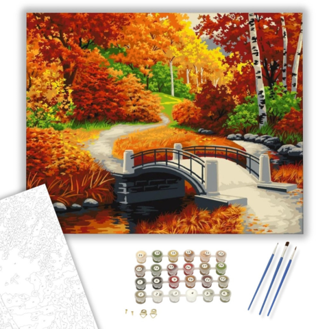 Őszi séta a parkban - számfestő készlet – 40×50 cm (Keretre feszítve) Az őszi táj meleg színeivel magával ragadó nyugalmat áraszt, mintha egy csendes séta közepébe csöppennénk. A kép mesés világot idéz, ahol minden levél egy történetet mesél el. A narancs