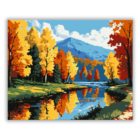Őszi Szimfónia - számfestő készlet – 40×50 cm (Keret nélkül) Fedezd fel az őszi színek pompáját ezzel a lenyűgöző festménnyel, amely tükrözi a színes faleveleket és a békés víztükröt. Ez a festmény tökéletes kiegészítője lehet otthonodnak, vagy ajándékkén