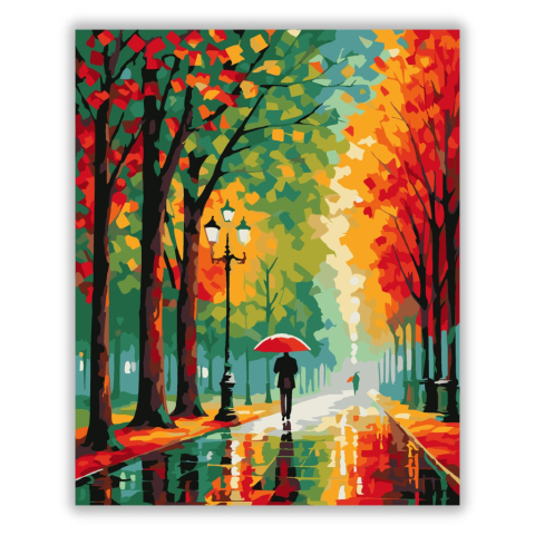 Őszi Színek Séta - számfestő készlet – 40×50 cm (Keret nélkül) A festmény egy magányos alakot ábrázol piros esernyő alatt, egy lámpákkal megvilágított úton, amit élénk színű fák szegélyeznek. A rubin, borostyán és smaragd színek meleg hangulatot teremtene