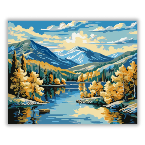 Őszi Tó Harmóniája - számfestő készlet – 40×50 cm (Keret nélkül) A festmény egy idilli hegyi tájat ábrázol, ahol a tavat körülölelő aranyló lombok ragyognak a napfényben. A gazdag színek és lendületes ecsetvonások életre keltik a természet csodáit, a kont