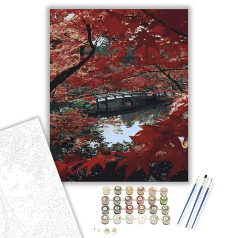 Őszi tó - számfestő készlet – 40×50 cm (Keretre feszítve) Ez a festmény egy nyugodt őszi táj hangulatát idézi, amelyben a vörös lombok alatt rejtőző híd mesebeli történeteket sugall. A mélyvörös és zöld színek kontrasztja élénkíti a kompozíciót, miközben