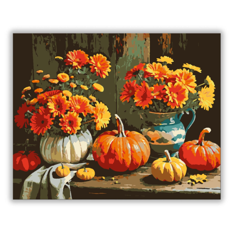 Őszi tökök és színpompás virágcsokor - számfestő készlet – 40×50 cm (Keret nélkül) Ez a festmény egy gyönyörű őszi csendéletet ábrázol, ahol színpompás virágok és különböző méretű tökök díszítik a rusztikus asztalt. Az élénk narancs és sárga virágok kontr