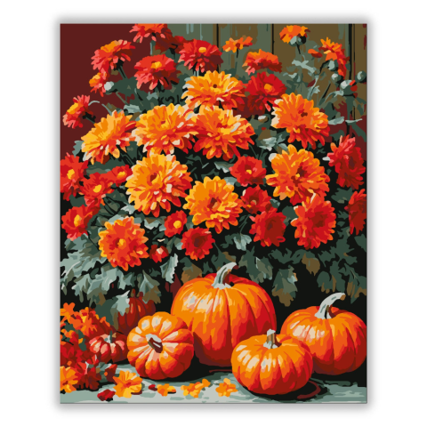 Őszi virágok és tökök - számfestő készlet – 40×50 cm (Keret nélkül) Ez a festmény színpompás őszi virágokat ábrázol, amelyek élénk narancssárga és vörös színekben tündökölnek. Az elrendezett tökök mély, meleg árnyalatai tökéletesen kiegészítik a virágok s