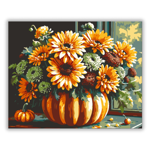 Őszi virágok tök vázában - számfestő készlet – 40×50 cm (Keret nélkül) Ez a festmény csodálatos őszi virágkompozíciót ábrázol, amely tökökbe ültetve díszíti a képet. A narancs, zöld és barna árnyalatok uralják a kompozíciót, amely otthonod tökéletes őszi