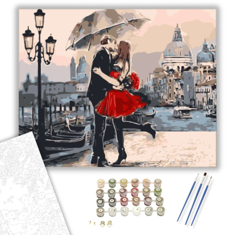 Őszinte Szerelem - számfestő készlet – 40×50 cm (Keretre feszítve) Ez a festmény egy romantikus pillanatot ragad meg, amely magával ragadja a nézőt. A háttérben meghúzódó épületek és a pár közötti intimitás mesés történetet sejtet. A színek harmóniája és