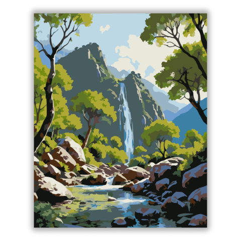 Ourika-völgyi Frissítő Hegyi Forrás - számfestő készlet – 40×50 cm (Keret nélkül) A festmény az Ourika-völgy egyik hegyi forrását ábrázolja, ahol mohos sziklák és zuhatagok között kanyarog a víz. A színek élénk zöldek és kékségek, melyek nyugtató, termész