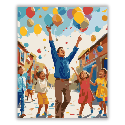 Óvodai Ballagás Színes Lufikkal - számfestő készlet – 40×50 cm (Keret nélkül) A festmény egy óvodai ballagást ábrázol, ahol gyerekek dobják a levegőbe a saját készítésű papírsapkáikat, miközben színes lufik szállnak az ég felé. A képen vidám szülők és élé