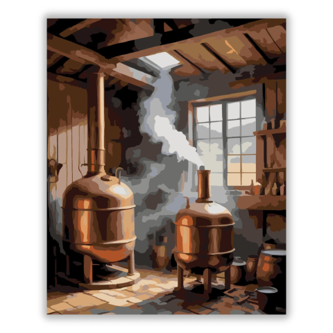 Pálinkafőzés Hagyományos Módon - számfestő készlet – 40×50 cm (Keret nélkül) A festmény egy régi vidéki pajtában zajló pálinkafőzést ábrázol, réz lepárlókkal és felszálló gőzzel. A meleg, földszínek és a réz csillogása otthonos és nosztalgikus hangulatot