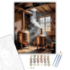 Pálinkafőzés Hagyományos Módon - számfestő készlet – 40×50 cm (Keretre feszítve) A festmény egy régi vidéki pajtában zajló pálinkafőzést ábrázol, réz lepárlókkal és felszálló gőzzel. A meleg, földszínek és a réz csillogása otthonos és nosztalgikus hangula
