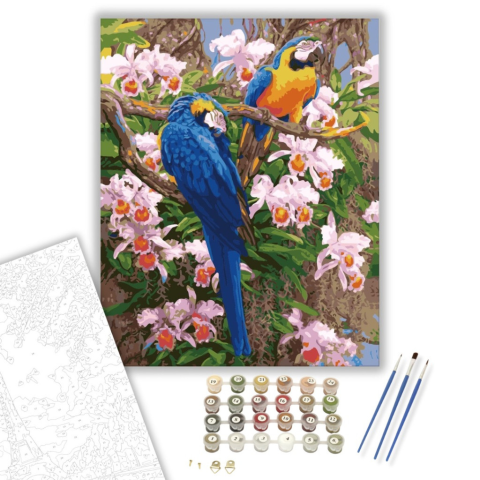 Papagájok - számfestő készlet – 40×50 cm (Keretre feszítve) A festmény élénk színeivel és egzotikus hangulatával azonnal magával ragadja a nézőt. Két papagáj pihen egy virágokkal teli ágon, mintha egy titkos trópusi kertben lennénk. A vibráló kék és naran