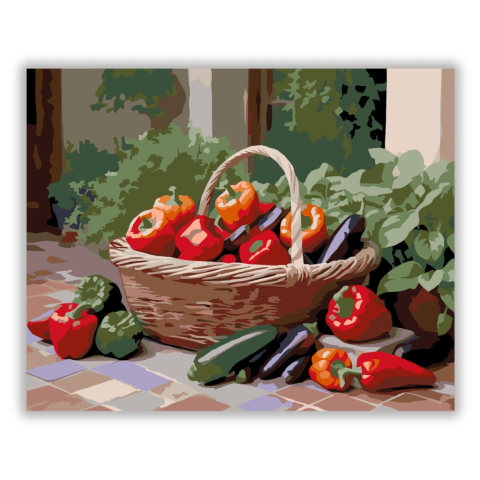 Paprikák és Padlizsánok Kosárban - számfestő készlet – 40×50 cm (Keret nélkül) A festmény egy fonott kosarat ábrázol, tele piros, zöld és narancssárga paprikákkal, padlizsánokkal és cukkinivel, egy terrakotta padlón elrendezve. Az élénk színek harmonikus