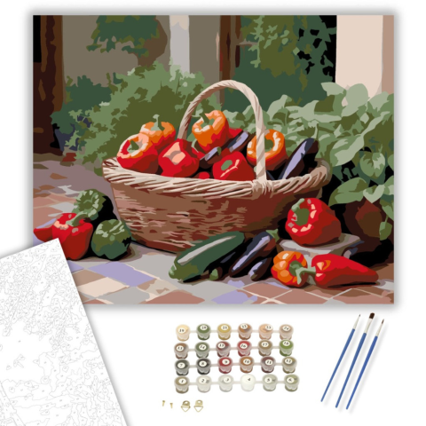 Paprikák és Padlizsánok Kosárban - számfestő készlet – 40×50 cm (Keretre feszítve) A festmény egy fonott kosarat ábrázol, tele piros, zöld és narancssárga paprikákkal, padlizsánokkal és cukkinivel, egy terrakotta padlón elrendezve. Az élénk színek harmoni