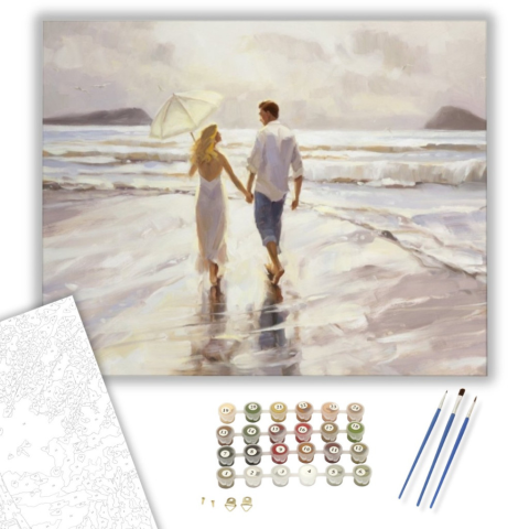 Pár a tengerparton- számfestő készlet – 40×50 cm (Keretre feszítve) A festmény csendes, romantikus hangulatot áraszt, amely a nézőt azonnal egy nyugodt tengerparti sétára invitálja. A képen egy szerelmes pár története bontakozik ki, akik kéz a kézben fede